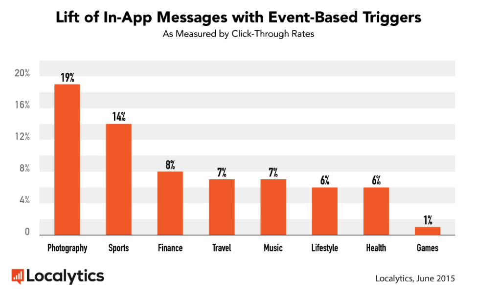 Certain app categories see a higher lift in click-through rates when using in-app messages triggered off of an event.