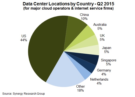 The two leading countries are then followed by Australia, UK, Japan, Singapore, Germany and the Netherlands, each of which accounts for 4% to 5% of the total. The research is based on an analysis of the data center footprint of 13 of the world’s major cloud and internet service firms, including the largest operators in IaaS, PaaS, SaaS, search, social networking and e-commerce.
