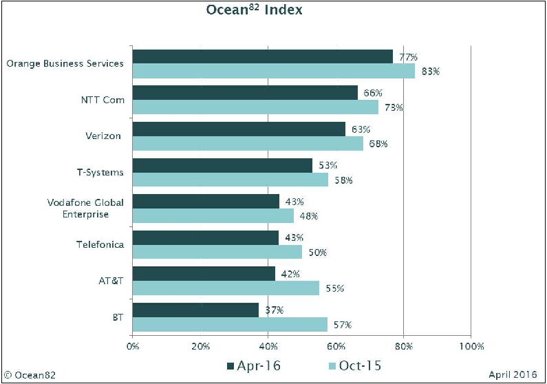 Ocean82 found an overall drop in scores across the board during the six months to April. Orange Business Services held onto top spot with a score of 77%, but it was down from 83% in October 2015. Second-placed NTT Communications scored 66%, compared to a previous score of 73%, while Verizon came in third with 63%, down from 68%. BT saw the biggest fall: its Ocean82 score fell to 37% from 57%.