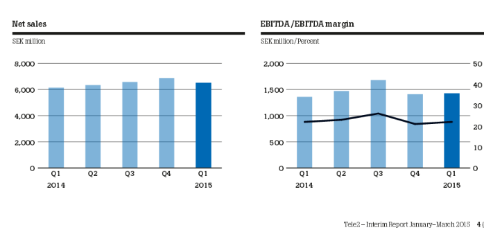 The results are based on continuing operations and exclude the SEK 1.8 billion capital gain realised on the sale of Tele2 Norway. Tele2 also started a 'challenger' programme in Q4 with the aim of increasing productivity and saving SEK 1 billion annually by 2018. This resulted in SEK 14 million in restructuring costs in Q1 and led to a 27 percent fall in EBIT to SEK 702 million.