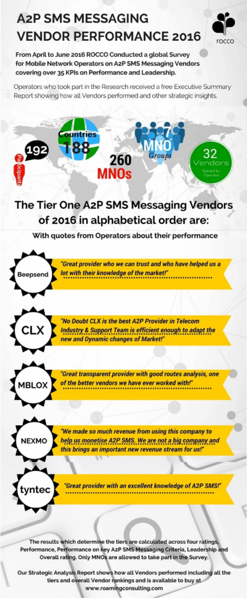 Between April and June 2016, ROCCO asked MNOs globally to give their perceptions of A2P SMS Messaging Vendors. How well they knew them and how they would rate them. They rated Vendors on 35+ KPIs in the area of Performance and Leadership. The survey was about brand perception, experience of these providers as well as understanding of whether MNOs would choose them over others.